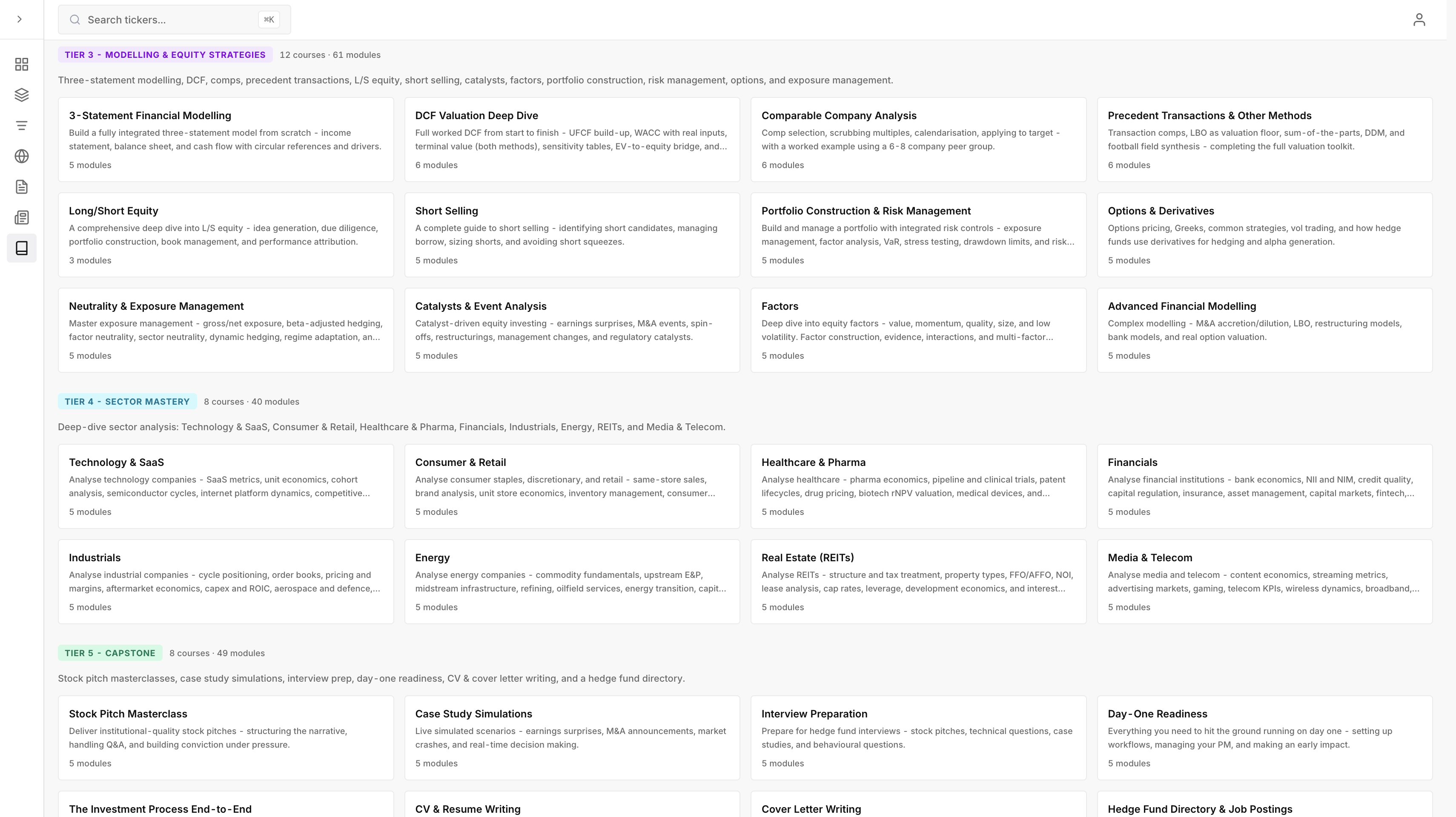 A structured curriculum of 44 courses and 234 modules built by hedge fund professionals. From equity research and financial modelling through portfolio construction, risk management, hedge fund strategies, and interview & application preparation. The same training institutional analysts receive, now accessible to everyone.