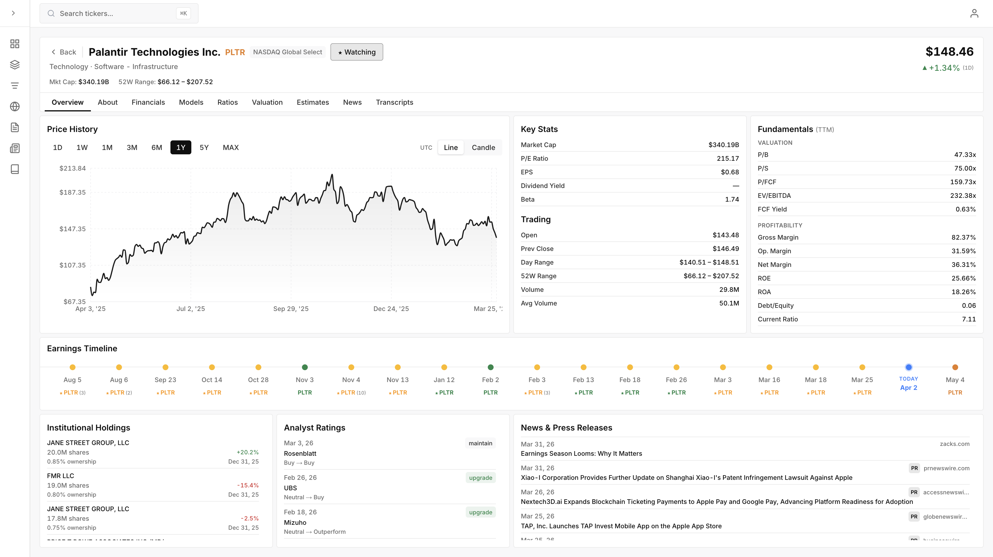 Everything you would find on a professional terminal. Live prices, financials, ratios, valuation, analyst estimates, earnings transcripts, ownership, and insider activity. Built-in financial models let you test assumptions directly on the company page.