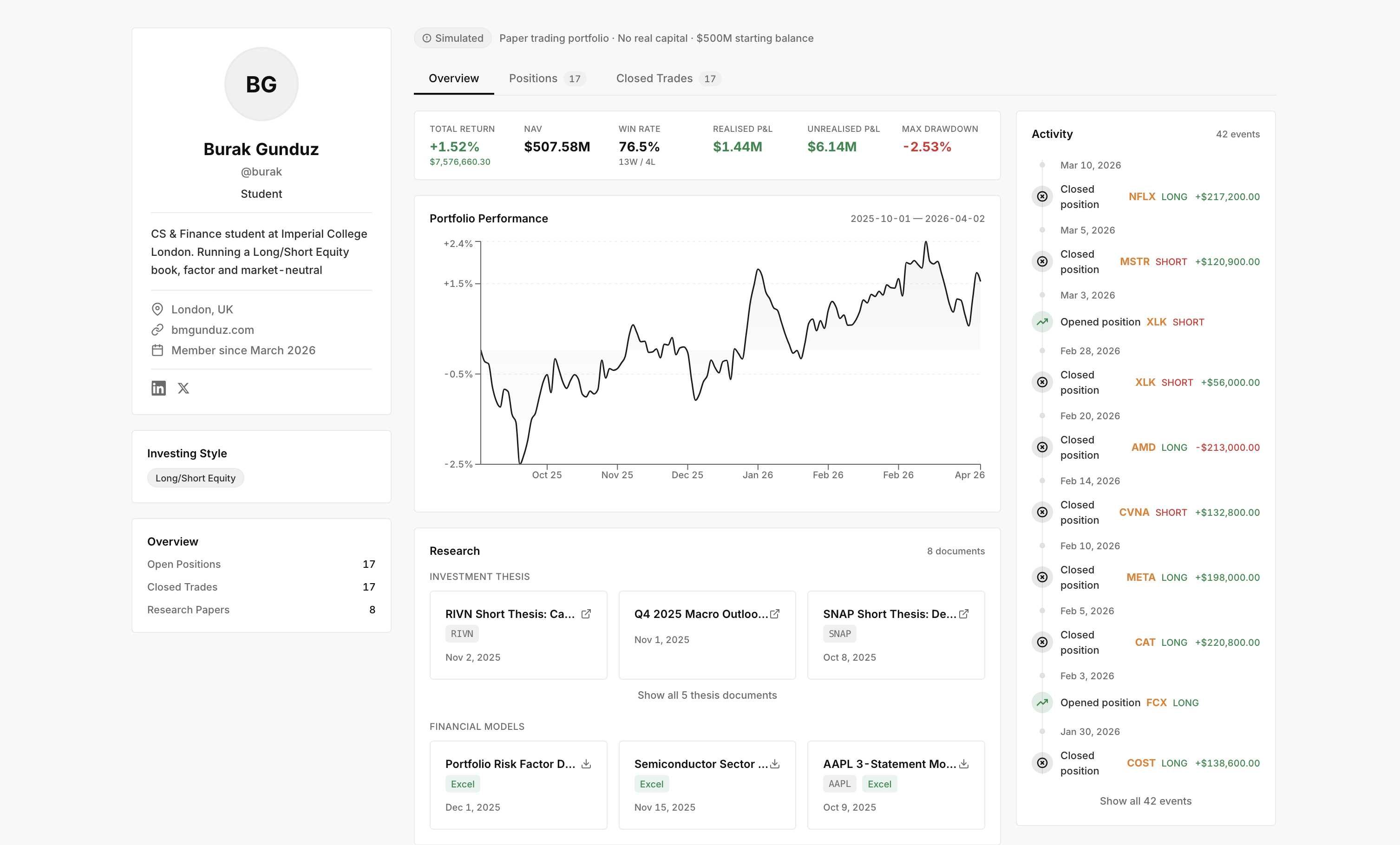 Your Deltashark profile is a public, verifiable record of your positions, performance, thesis work, and financial models. Link it from your CV. When a hiring manager sees it, they see exactly what you can do, not just what you studied.